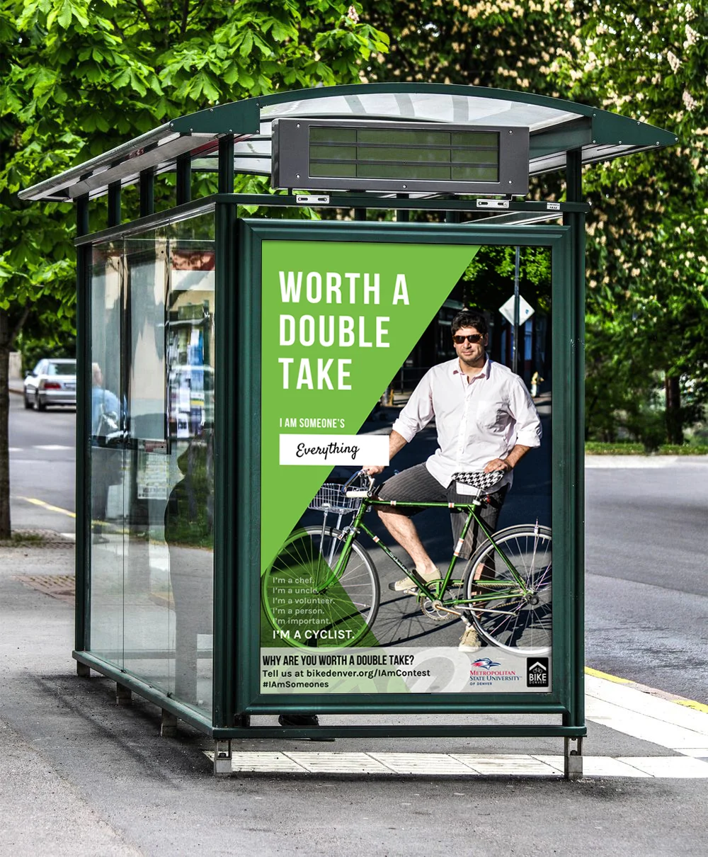 This four month long group project took us from ground up research to fully realized presentation. We started with a real world issue: bicycle safety in Denver. We worked through iterations of research to a final solution concerning the issue of safety. Through observations of existing bicycle safety standards, current laws, interviews, personas, and mind-mapping, my group decided to create a poster series featuring members within the community. By featuring members of the community, our posters would take on a humanizing aspect, letting the community see and understand why bicyclist are worth a “double take.” These posters targeted the humanization of bicyclists by explaining why people are worth a double take and not just obstacles on the road. My role was in concept development as well as certain aspects of the design layout in the finalized poster series.